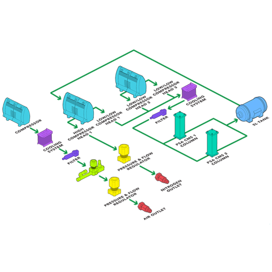 Nitrogen is produced at low pressure, which ensures a longer compressor life and then compressed to 8 barg (116 psig) using a second stage compressor. This combination guarantees a long compressor life reducing maintenance costs and down time. Air is produced using an additional third stage compressor maintaining a separate constant flow and pressure.